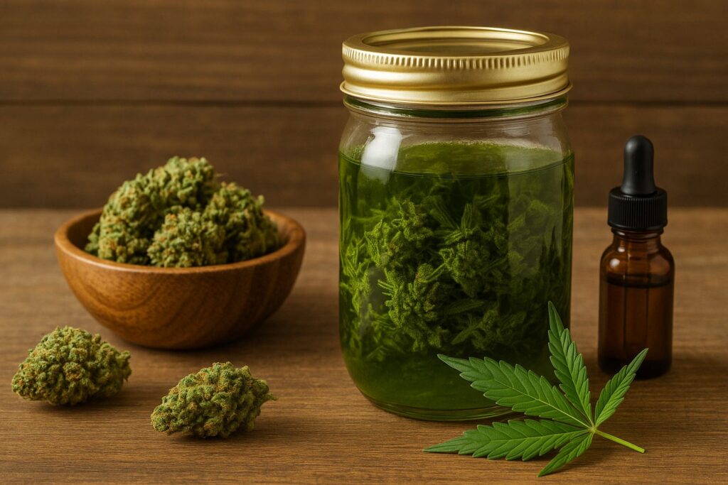 A homemade cannabis tincture can be alcohol-based or glycerin-based. I prefer neutral spirits for long-term storage and glycerin for people who avoid alcohol. Either way, I combine the decarbed plant material with the chosen solvent in a jar, stir it thoroughly, and let it steep while stored safely out of reach of anyone who should not have access.