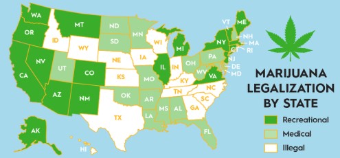 - Federally Illegal, but 24 states (including California, Colorado, New York, Oregon, etc.) have legalized recreational marijuana.