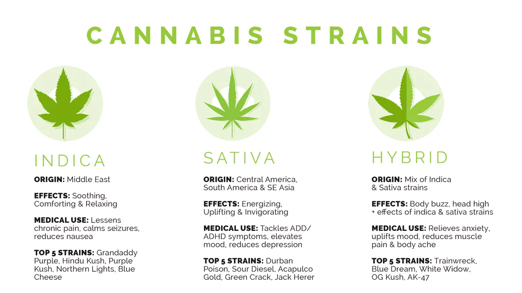 - Sativa: Sour Diesel, Jack Herer, Green Crack.