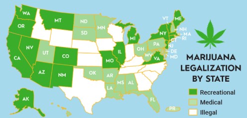 Marijuana is legal for recreational use in 24 states and Washington, D.C., including California, Colorado, New York, and Illinois. Over 30 states permit medical marijuana with varying conditions. However, cannabis remains illegal at the federal level, classified as a Schedule I drug under the Controlled Substances Act.